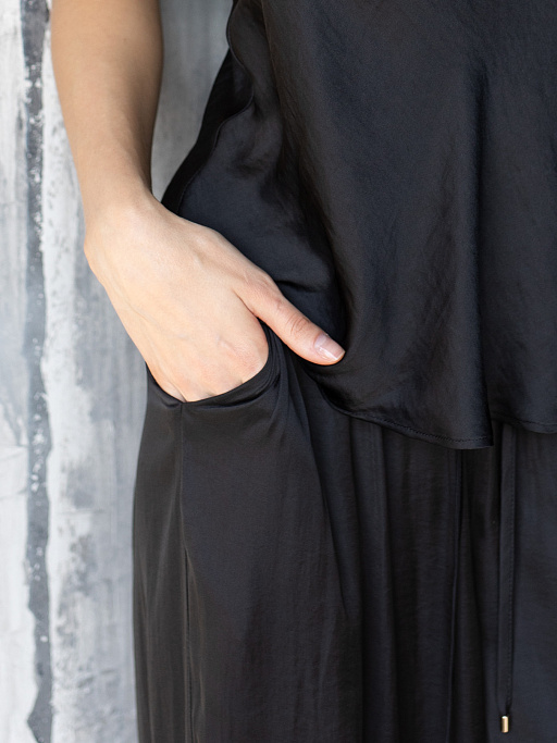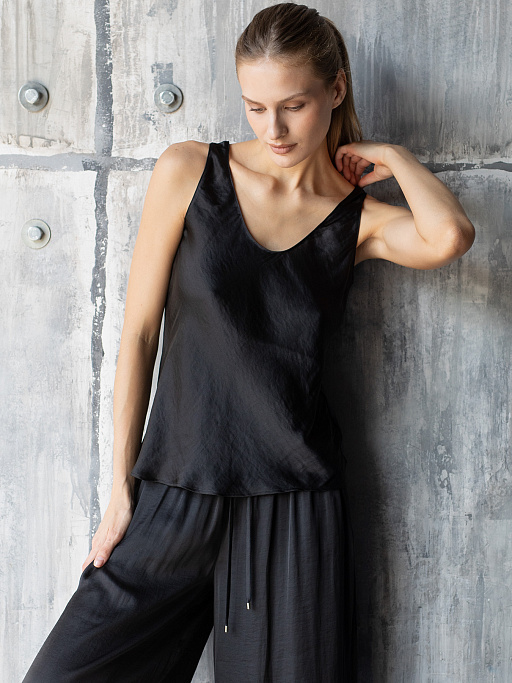Костюм женский легкий для дома и отдыха. Широкие брюки палаццо на резинке и топ без рукавов – идеальный базовый комплект для расслабленного времяпровождения. Шелковая струящаяся ткань нежна и приятна к телу. Брюки с боковыми карманами. Широкая резинка на кулиске с эглетами. Топ с круглым вырезом скроен по косой, что обеспечивает идеальную посадку по фигуре. Удобен и незаменим.