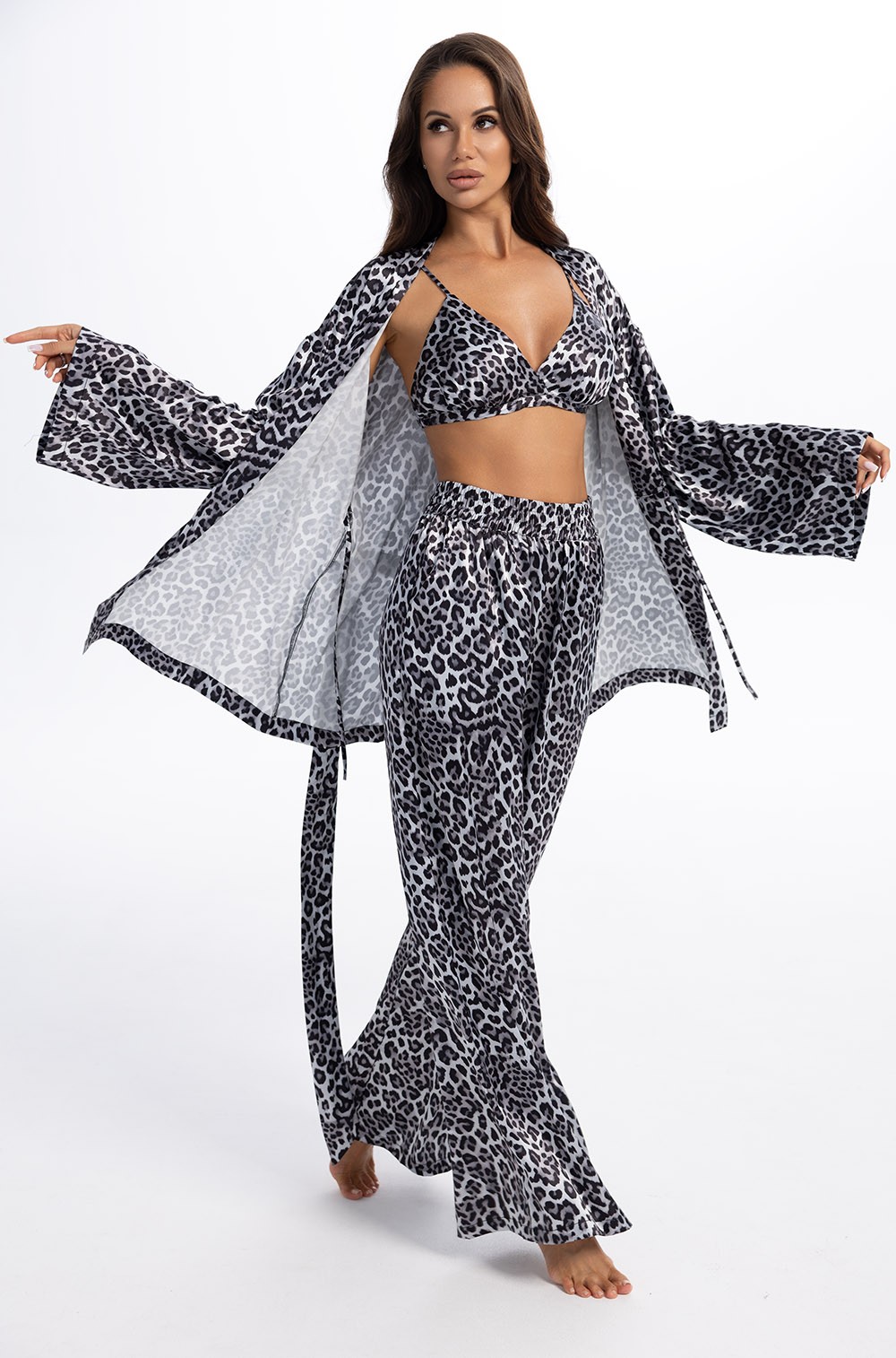 Комплект Mia-Amore состоит из запашного жакета, брюк-палаццо и топа выполнен из смесового шёлка с анималистичным принтом. Брюки с эластичным поясом и с боковыми карманами. Жакет комплектуется широким поясом. Топ с эластичной резинкой по окружности под грудью и регулируемыми бретелями, что делает его комфортным в носке.