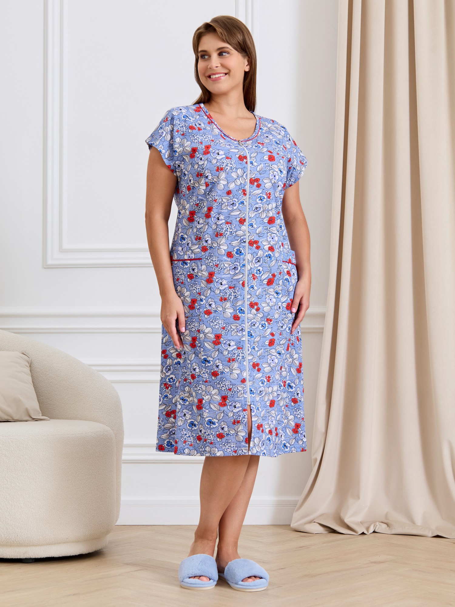 Халат женский из трикотажного полотна «кулирка» с набивным рисунком, свободного покроя, расширенный к низу, короткими цельнокроеными рукавами, горловиной овальной формы, окантованной двойным кантом, центральной бортовой застежкой на тесьму «молния». Полочки с рельефными швами, карманами на уровне беде. Верхние срезы карманов обработаны притачными планками с кантом.