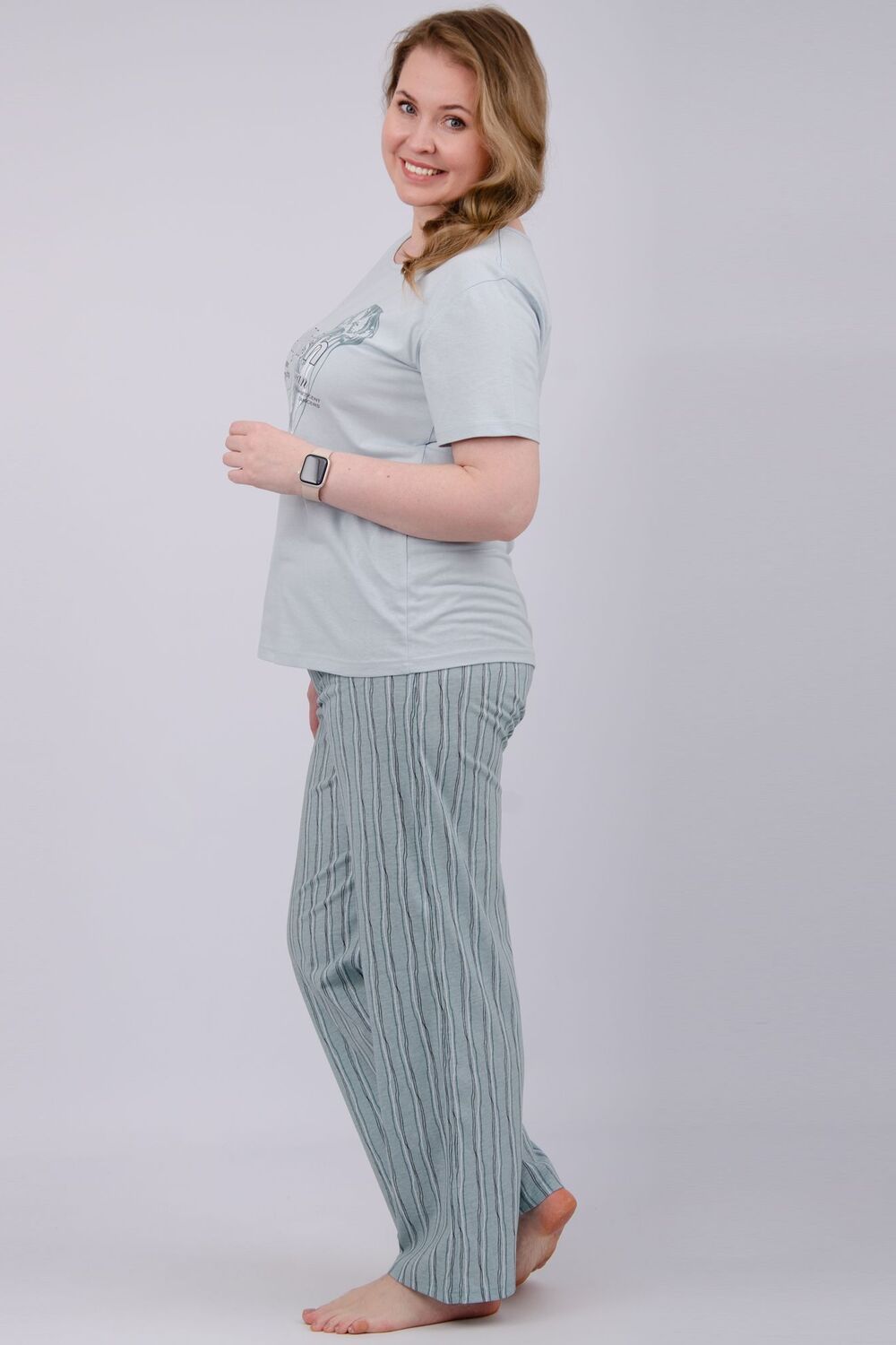 Наша пижама выполнена из мягкого и приятного на ощупь трикотажа, который обеспечивает максимальный комфорт во время сна и отдыха. Материал прекрасно дышит, не вызывает аллергии и раздражения кожи. Благодаря своей структуре он сохраняет тепло в холодное время года, и создает ощущение легкости и свежести в летнее время. Пижама представлена в нескольких размерах, включая большие, чтобы каждая женщина могла найти подходящий вариант, который подходит именно вам. Цвет: эвкалипт; Материал: кулирка;кулирка; Состав: 100% хлопок.