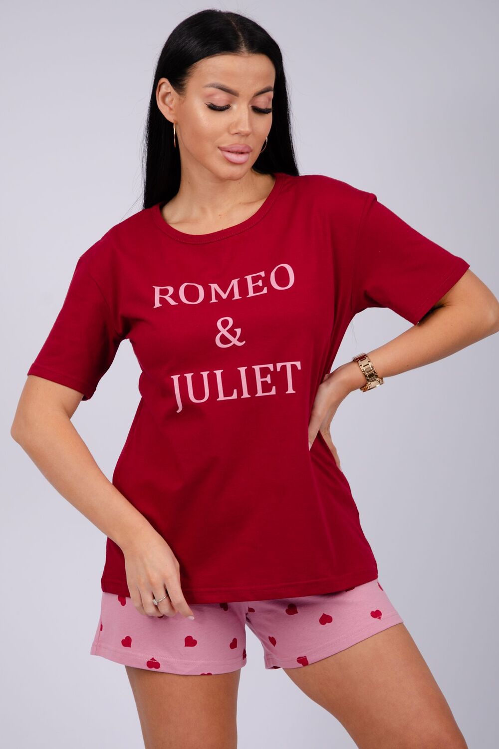 Пижама женская состоит из футболки с коротким рукавом и шортов. Футболка из однотонной кулирки с принтом. Цвет: бордовый; Материал: кулирка;кулирка; Состав: 100% хлопок.