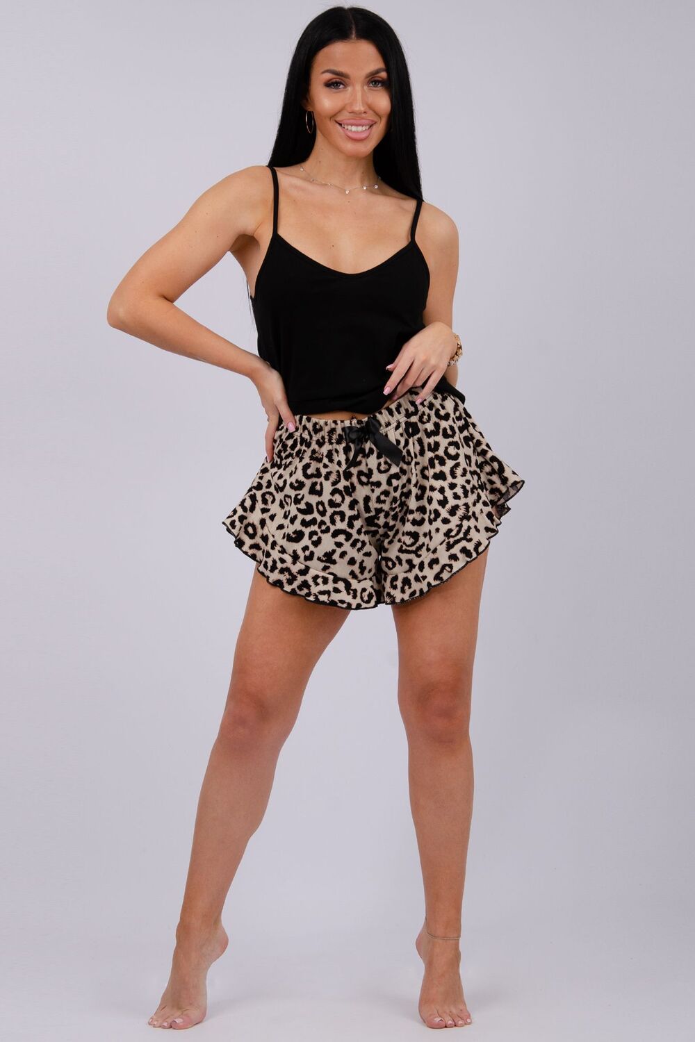 Пижама женская с шортами идеальный выбор для комфортного сна и отдыха дома. Домашняя одежда должна быть не только удобной, но и красивой. Данная ночная пижама прекрасно подчеркивает женственность благодаря аккуратным рюшам, добавляя милую нотку во внешний вид. Эстетичная лапша по поверхности ткани придает комплекту дополнительную фактурность и современность. Такой вариант отлично подойдет как для подростков, так и для взрослых универсальность дизайна позволяет чувствовать себя уверенно и уютно независимо от возраста. Милый комплект предназначен для тех, кто ценит стильные решения в домашнем гардеробе. Цвет: черный/леопард на бежевом; Материал: кулирка;кашкорсе;кашкорсе;кулирка; Состав: 100% хлопок (верх), 100% полиэстер (низ).