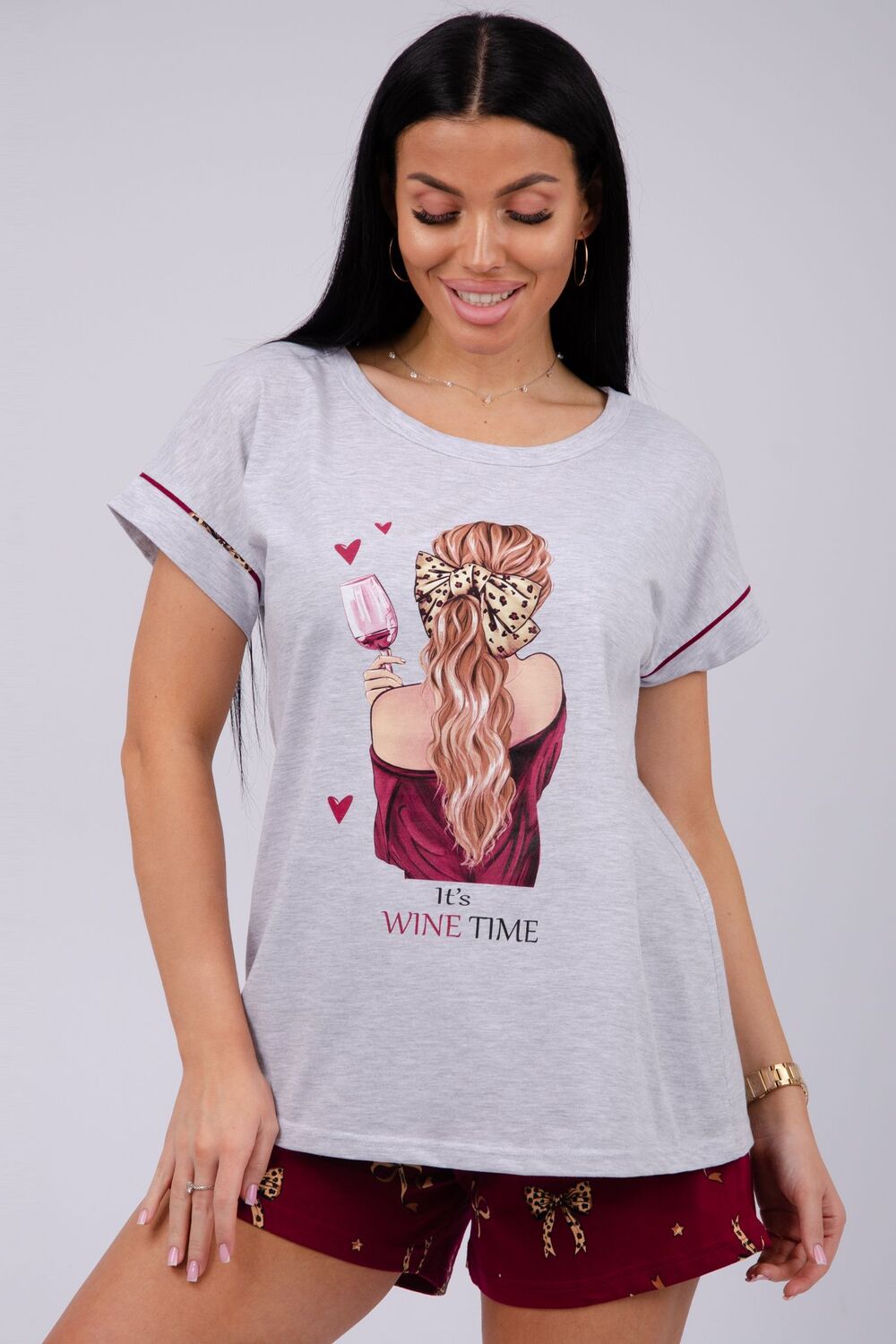 Пижама женская состоит из футболки с коротким рукавом и шортов. Футболка из однотонной кулирки с красивым принтом. Цвет: бордовый; Материал: кулирка;кулирка; Состав: 80% хлопок, 20% полистер.