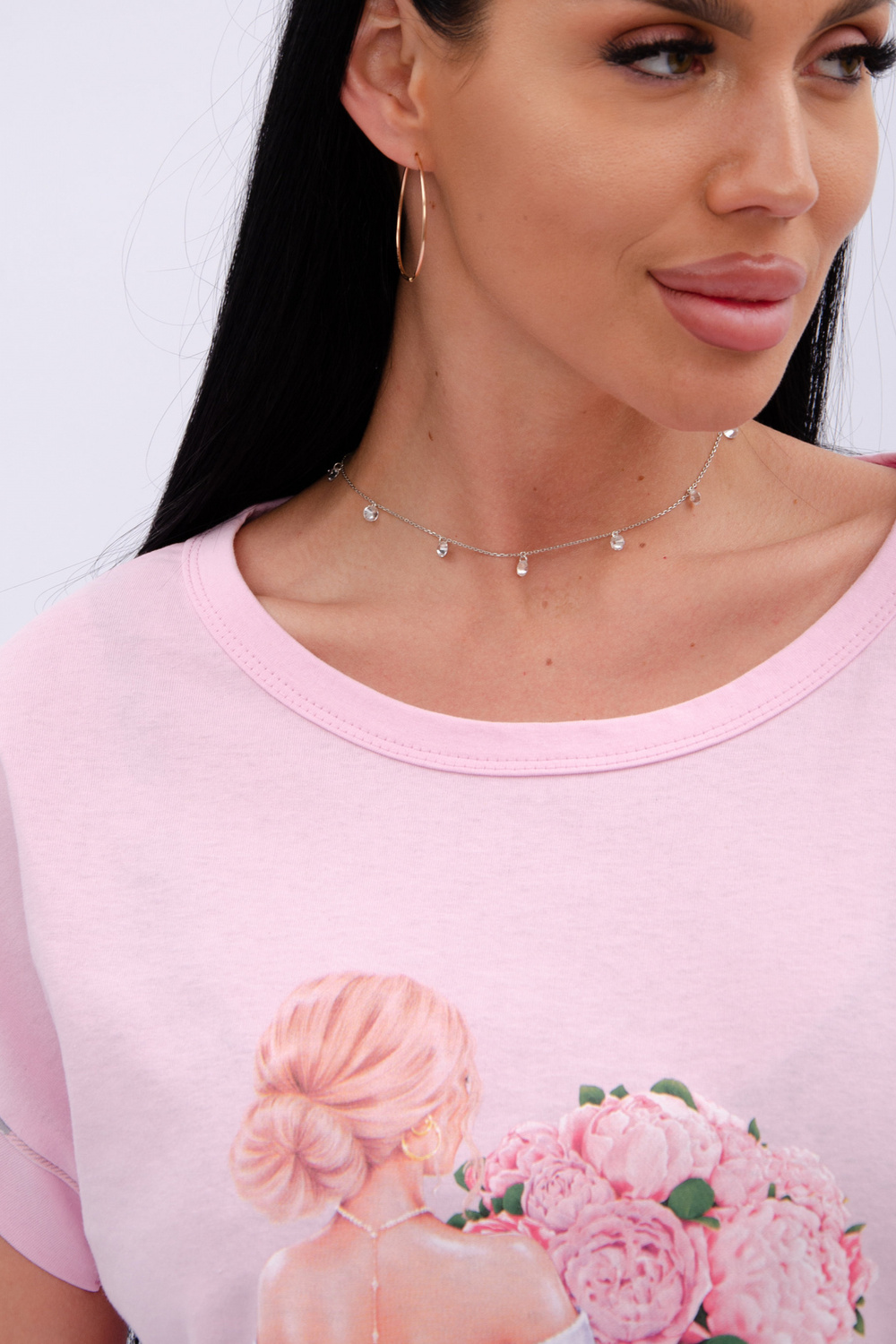 Пижама женская состоит из футболки с коротким рукавом и шортов. Футболка из однотонной кулирки с красивым принтом, шорты свободного покроя из ткани кулирка. Цвет: розовый; Материал: кулирка;кулирка; Состав: 100% хлопок.