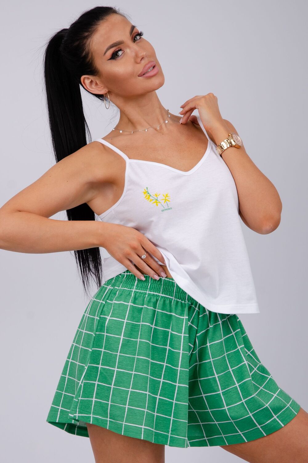 Эта женская пижама станет идеальным выбором для комфортного отдыха дома. Она сшита из мягкого, приятного на ощупь материала. Каждый элемент продуман для максимального удобства. Топ имеет аккуратный вырез, а шорты обеспечивают свободу движения. Цвет: белый/зеленый; Материал: кулирка;кулирка; Состав: 100% хлопок.
