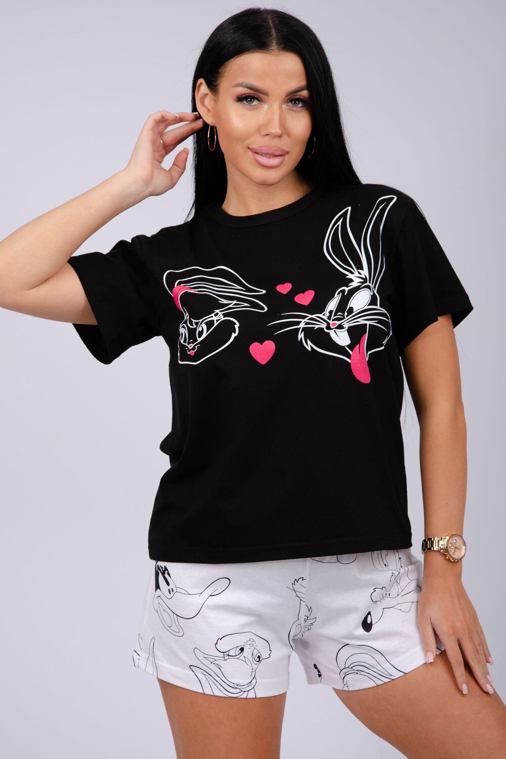 Пижама женская состоит из футболки с коротким рукавом и шортов. Футболка из однотонной кулирки с красивым принтом, шорты свободного покроя из ткани кулирка. Цвет: ; Материал: кулирка;кулирка; Состав: 100% хлопок.