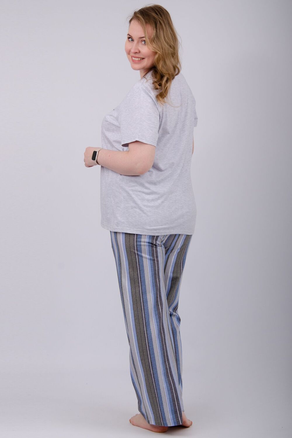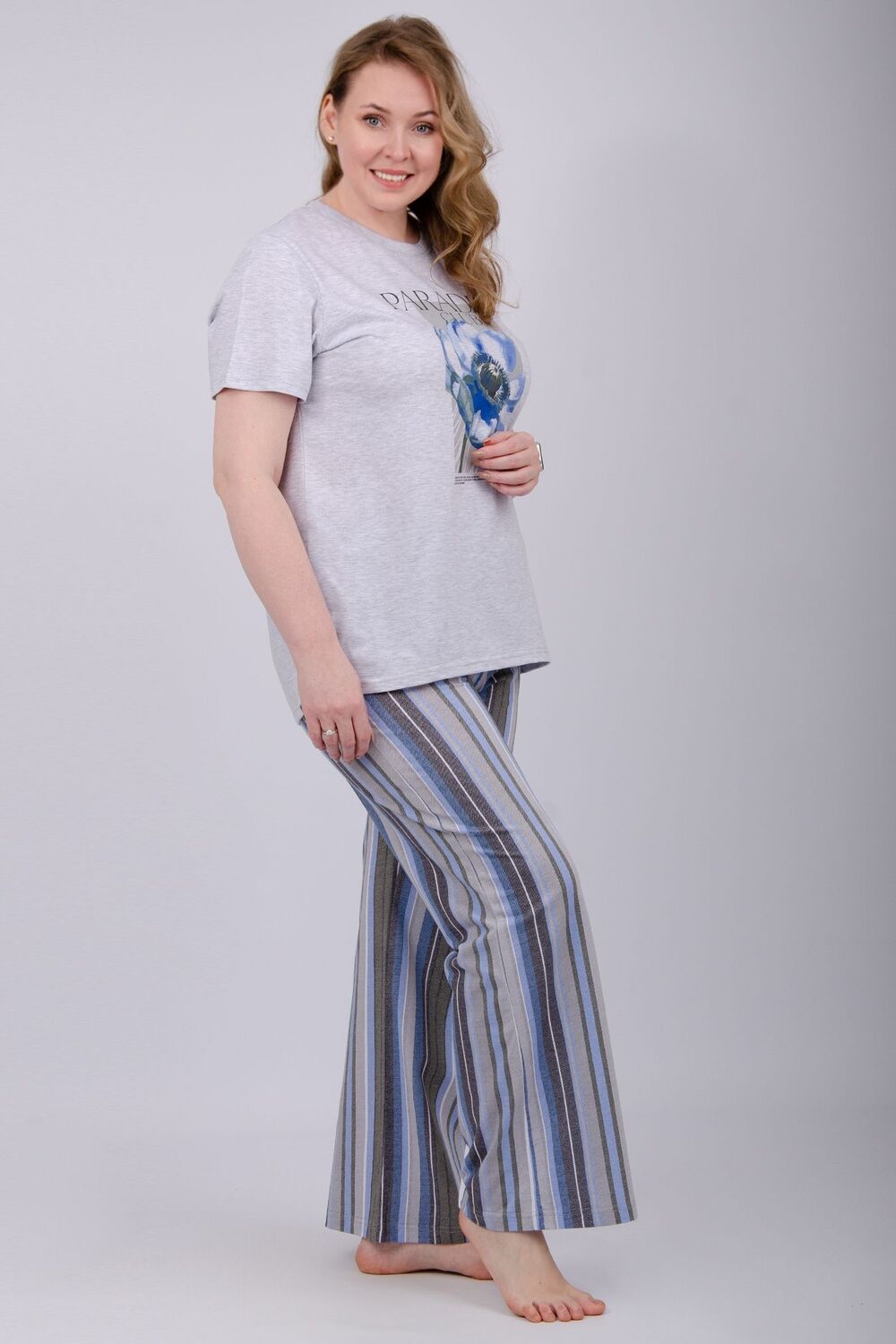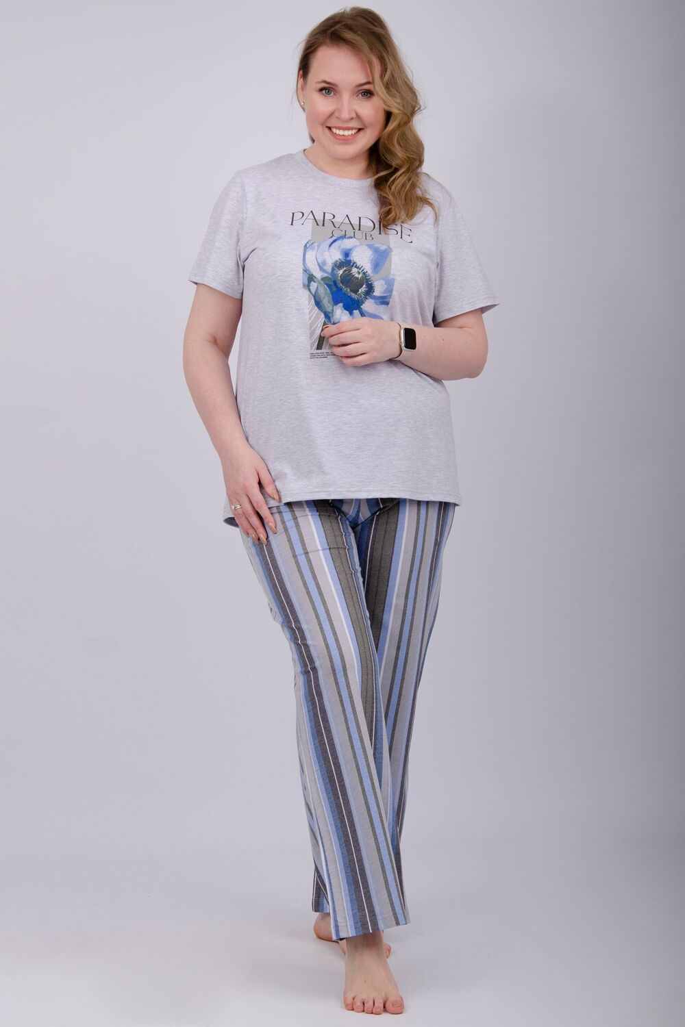Наша пижама выполнена из мягкого и приятного на ощупь трикотажа, который обеспечивает максимальный комфорт во время сна и отдыха. Материал прекрасно дышит, не вызывает аллергии и раздражения кожи. Благодаря своей структуре он сохраняет тепло в холодное время года, и создает ощущение легкости и свежести в летнее время. Пижама представлена в нескольких размерах, включая большие, чтобы каждая женщина могла найти подходящий вариант, который подходит именно вам. Цвет: светло-серый; Материал: кулирка;кулирка; Состав: 80% хлопок, 20% полиэстер.