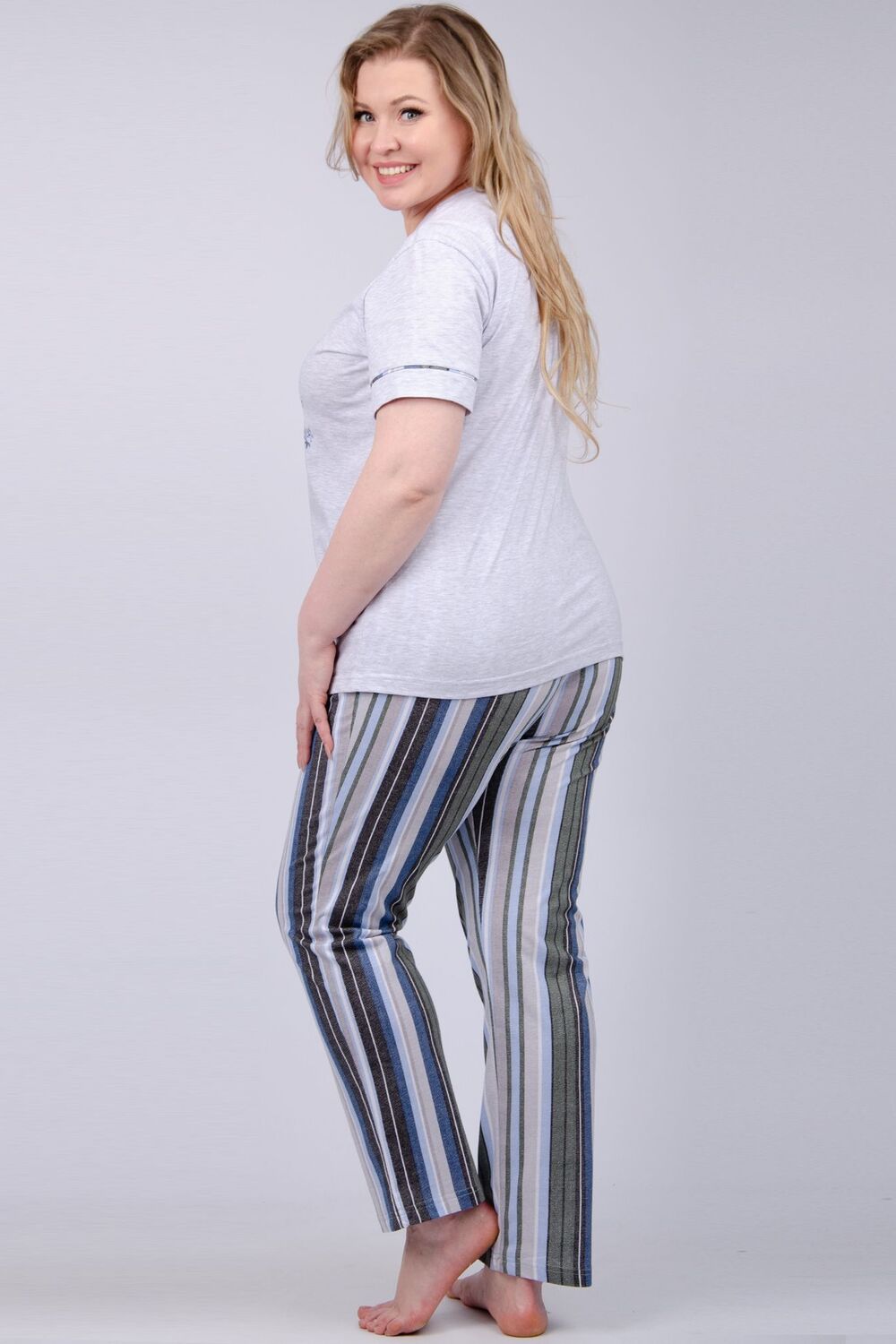 Пижама женская со штанами изготовлена из мягкой ткани (100 % хлопка), которая обладает дышащими и влаговпитывающими свойствами, идеально подходит для сна, обеспечивает максимальную практичность и воздухопроницаемость, облегчая сон даже в самые жаркие и холодные ночи. Женский домашний костюм состоит из стильной тонкой ночной футболки с коротким рукавом и легких брюк, которые создают комфортный домашний уют дома. Милая женская пижамка украшена принтом. Пижама женская яркая и в тоже время нежная, идеальна для беременных, будущих мам или в роддом, ведь в этой пижаме для беременных удобно весь день. Носить можно в любое время года: осенью или даже зимой под согревающим одеялом. Цвет: серый-зеленый; Материал: кулирка;кулирка; Состав: 100% хлопок.