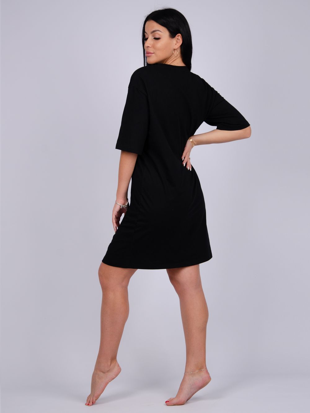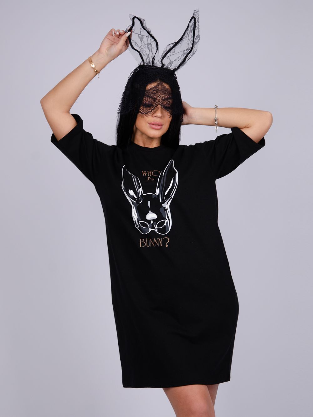 Ночная сорочка Зайка - это идеальный выбор для комфортного сна и отдыха. Сшита из 100% хлопка. Хлопок невероятно мягкий на ощупь и позволяет коже дышать. Милый принт добавит нотку очарования вашему образу. Сорочка представлена в широком диапазоне размеров, что делает ее универсальным выбором для всех. Цвет: черный; Материал: кулирка; Состав: 100% хлопок.