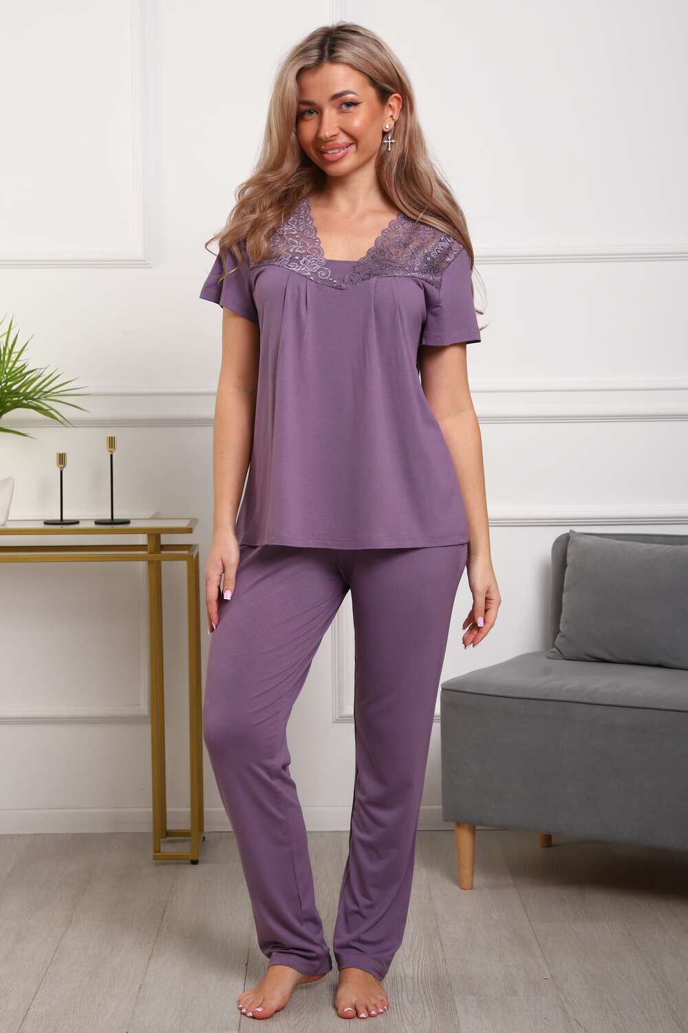 Пижама женская из вискозы. Состоит из туники и брюк. Верх прямого силуэта, чуть расклешённый к низу, ниже середины бедра. Рукав короткий. Горловина V-образной формы, отделана кружевом. Низ прямой. Цвет: коричневый;лиловый;синий;бордо;изумрудный; Материал: вискоза;вискоза; Состав: Вискоза 92% Лайкра 8%.
