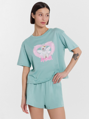 Комплект женский состоит из рубашки и шорт. Рубашка свободного силуэта, с отложным воротником. Рукав втачной короткий, линия плеча немного спущена, рукав обработан вподгибку. Рубашка с центральной застежкой с петлями и пуговицами. Низ застрочен швом в подгибку. Шорты свободного силуэта, верх застрочен в подгибку с резиной внутри 30RV. Низ шорт обработан вподгибку. Декор по заданию