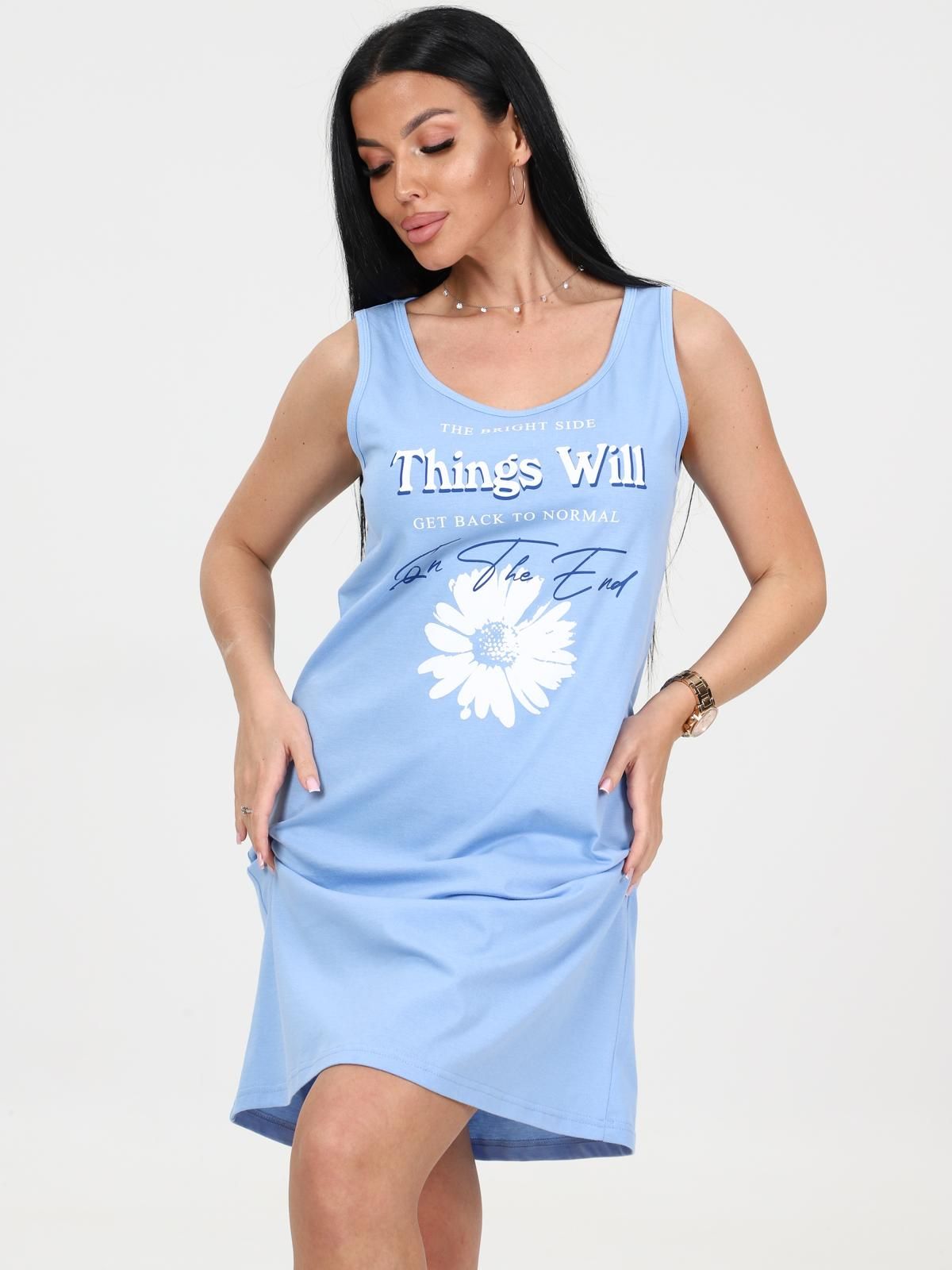 Сорочка выполнена из однотонного трикотажного полотна «кулирка». Сорочка полуприлегающего силуэта с круглым вырезом горловины без рукава на широких бретелях. Вырез горловины и проймы обработаны кантом из основной ткани. Сорочка украшена нежным принтом.