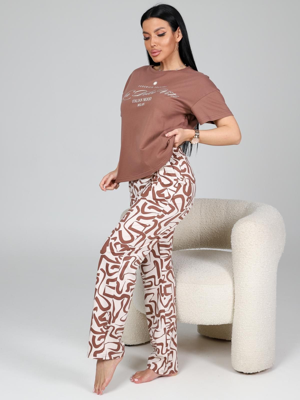 Пижама "Мэрин" из трикотажного полотна "кулирка" состоит из футболки и брюк. Футболка из гладкокрашенного трикотажного полотна свободного покроя со спущенной линией плеча, короткими втачными рукавами, горловиной овальной формы, обработанной втачной планкой. Полочка украшена принтом. Брюки из набивного трикотажного полотна длинные, свободного покроя, на притачном поясе с эластичной лентой и карманами в боковых швах.