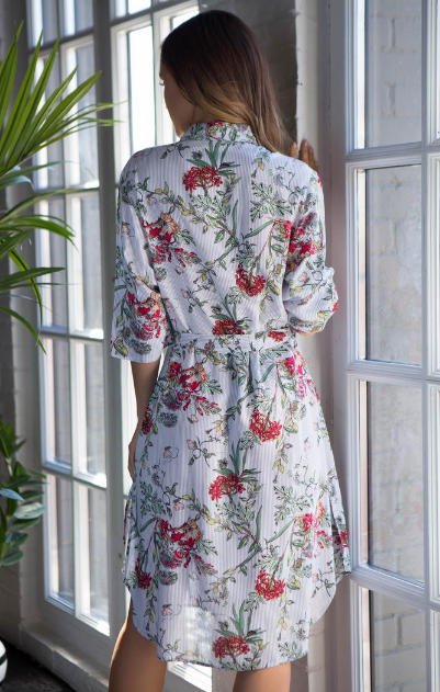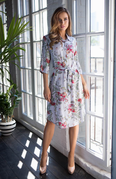 Туника Миа-Миа домашняя женская длиной ниже колена, полуприлегающего силуэта из принтованной вискозы. Воротник рубашечного типа. Туника застегивается на пуговицы и подвязывается поясом.