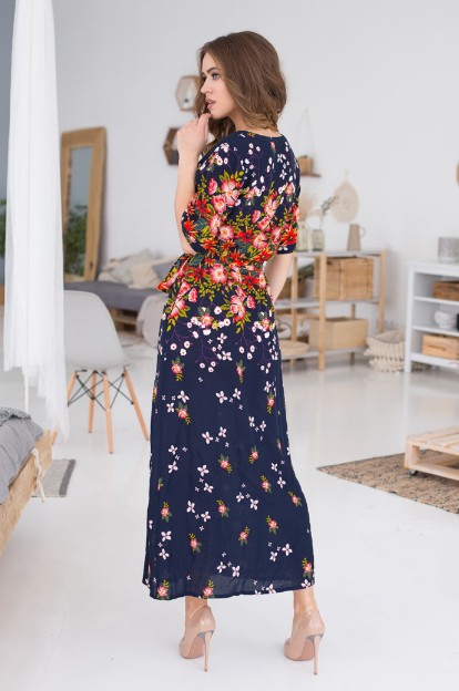 Модель на поясе свободного силуэта длиной в пол. Рукав прямой длиной до локтя Фигурный вырез горловины с обтачкой из принтованной вискозы. В боковых швах изделия карманы.
