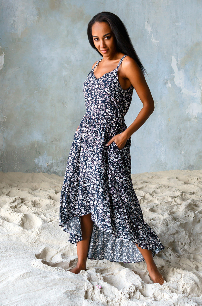 Платье выполнено из вискозы с фантазийным принтом. Модель приталенного силуэта с поясом по талии. Платье на широких регулируемых бретельках, по подолу рюша. Модель имеет удлиненный подол сзади. 100% вискоза