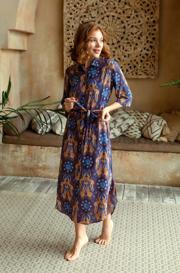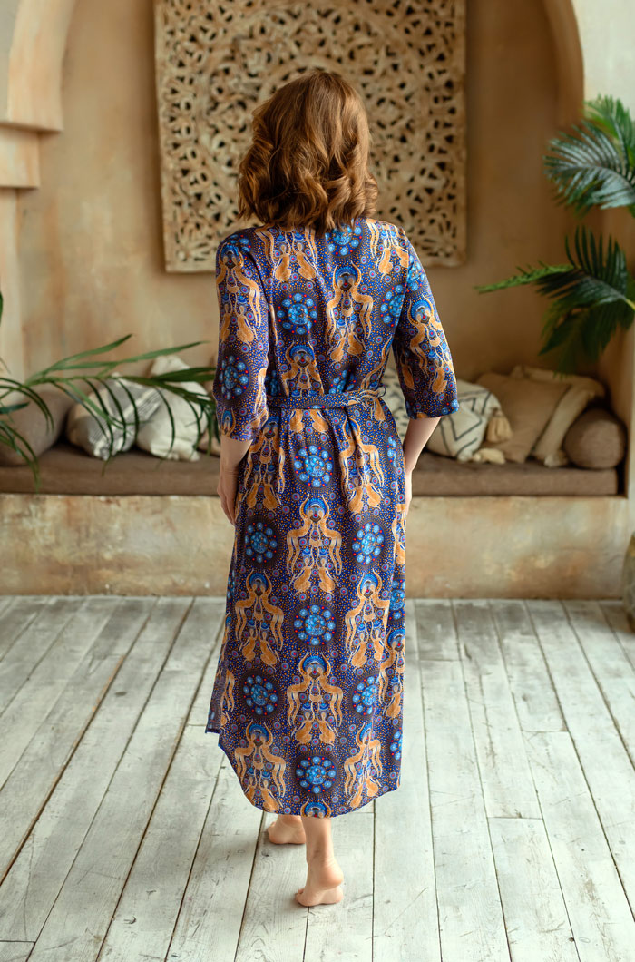 Платье домашнее женское Миа-Миа выполнено из принтованной яркой вискозы. Модель на поясе свободногосилуэта длиной в пол. Рукав прямой длиной до локтя. Фигурный вырез горловины с обтачкой. В боковых швах карманы. 100% вискоза