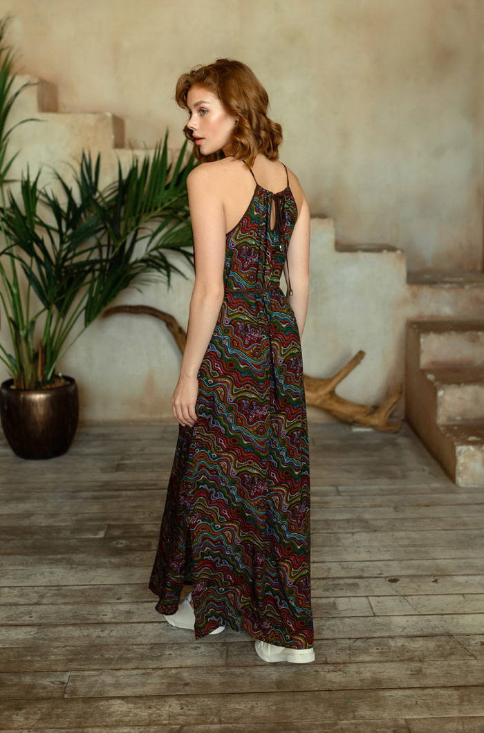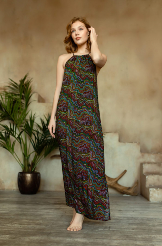 Длинное домашнее женское платье Миа-Миа прямого силуэта из яркой принтованной вискозы на поясе-шурке. Высота лифа регулируется с помощью шнура по горловине. Разрез по боковому шву. 100% вискоза