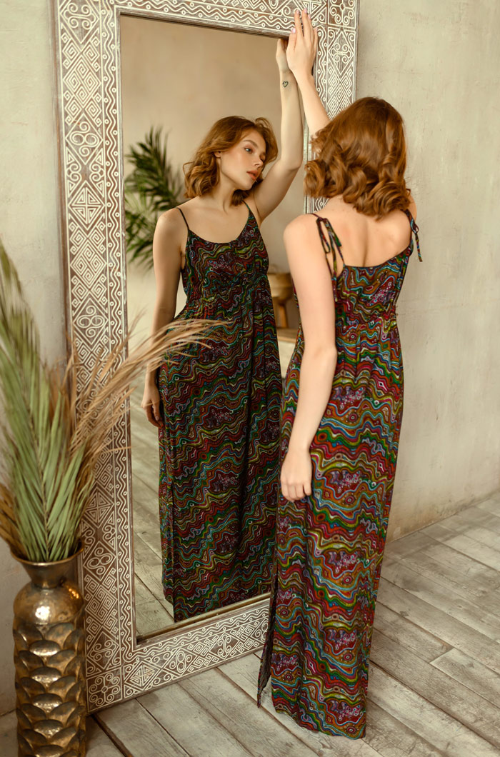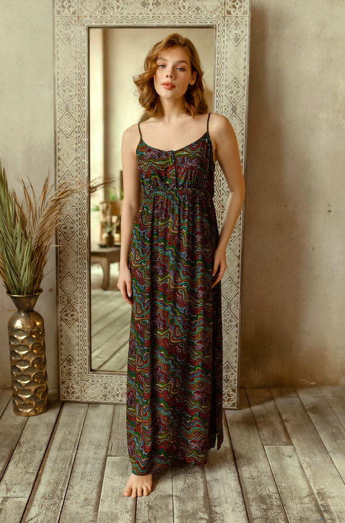 Платье Миа-Миа прямого силуэта, выполненое из вискозы с фантазийным принтом. Лиф отрезной, чуть выше линии талии на эластичной тесьме "резинке". Спереди планка на 4-х пуговицах и петлях. Тонкие бретели позволяют регулировать высоту лифа данной модели. 100% вискоза