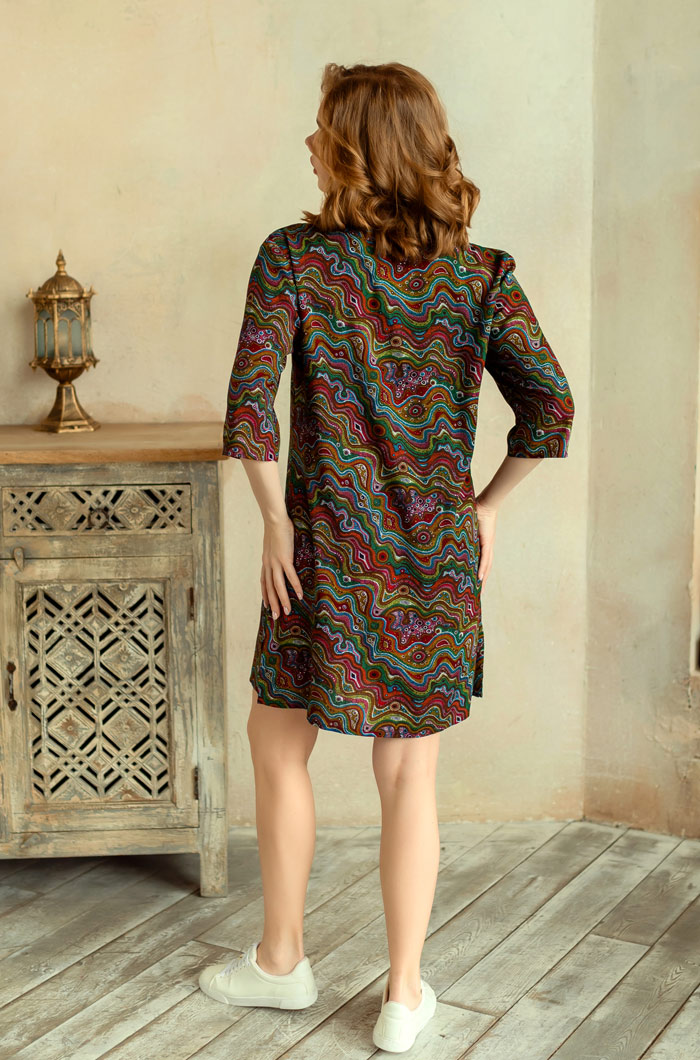 Туника Миа-Миа средней длины прямого силуэта с круглым вырезом горловины на полочке и спинке из принтованной вискозы. Модель с втачными широкими рукавами и боковыми разрезами. Круглый вырез горловины полочки и спинки обработан притачной фигурной обтачкой. V-образный разрез на горловине полочки обработан притачной планкой. Планка туники декорирована тонким шнурком, который продергивается через люверсы. 100% вискоза