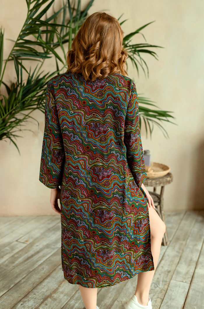 Длинная туника Миа-Миа прямого силуэта с круглым вырезом горловины на полочке и спинке из принтованной вискозы. Модель с втачными широкими рукавами. Круглый вырез горловины полочки и спинки обработан притачной фигурной обтачкой. V-образный разрез на горловине полочки обработан притачной планкой. Планка туники застегивается на петли и обтяжные пуговицы из основной ткани. 100% вискоза