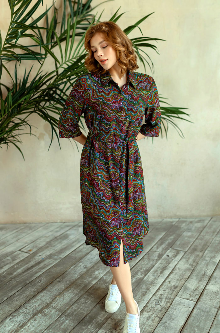 Туника домашяя женская Миа-Миа выполненная из принтованной вискозы. Модель на поясе свободного силуэта длины миди. Туника рубашечного типа с воротником стойкой и планкой застежкой на пуговицах. Рукав прямой длиной 3/4 100% вискоза
