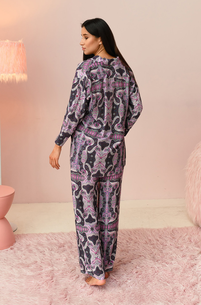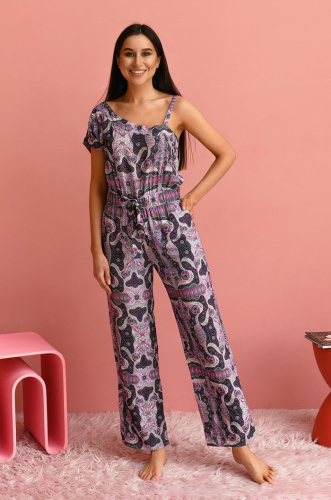 Комплект из туники и брюк, из принтованной вискозы. Туника напоминает классическую мужскую рубашку. Отложной воротник со стойкой и застежка планка на пуговицах. Рукав прямой с манжетой на пуговице и с застежкой платой. Заниженная линяя плеча, спущенный рукав, рубашечного кроя. Полочка с вертикальными выточками складками. Спинка удлиненная, с кокеткой и вертикальными выточками складками. Нижний срез туники оформлен полукругом. Брюки, свободного силуэта с карманами. По линии талии на эластичной тесьме и поясе-кулиске. 100% вискоза