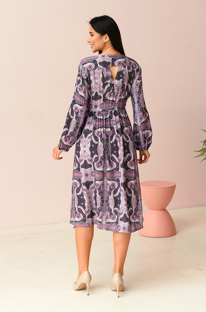 Длинное платье с завышенной линией талии, из принтованной вискозы. Лиф и юбка соединены эластичной тесьмой. V-образная горловина, обработана обтачкой. Кокетка на спинке, соединяет V-образный вырез, создает треугольный вид. Рукав длинный расширенный к низу, низ рукава на эластичной тесьме. 100% вискоза