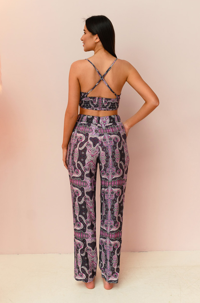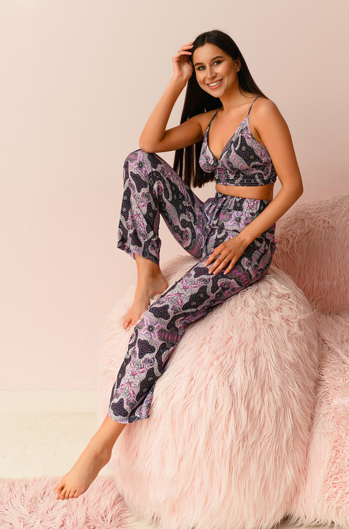 Комплект из топа и брюк, из принтованной вискозы. Легкий укороченный топ треугольник, на широкой резинке под грудью. Глубокий V-образный вырез. Регулировка бретелями из основного полотна. Брюки с карманами, свободного силуэта. Пояс на завязке-кулиске и эластичной ленте. 100% вискоза