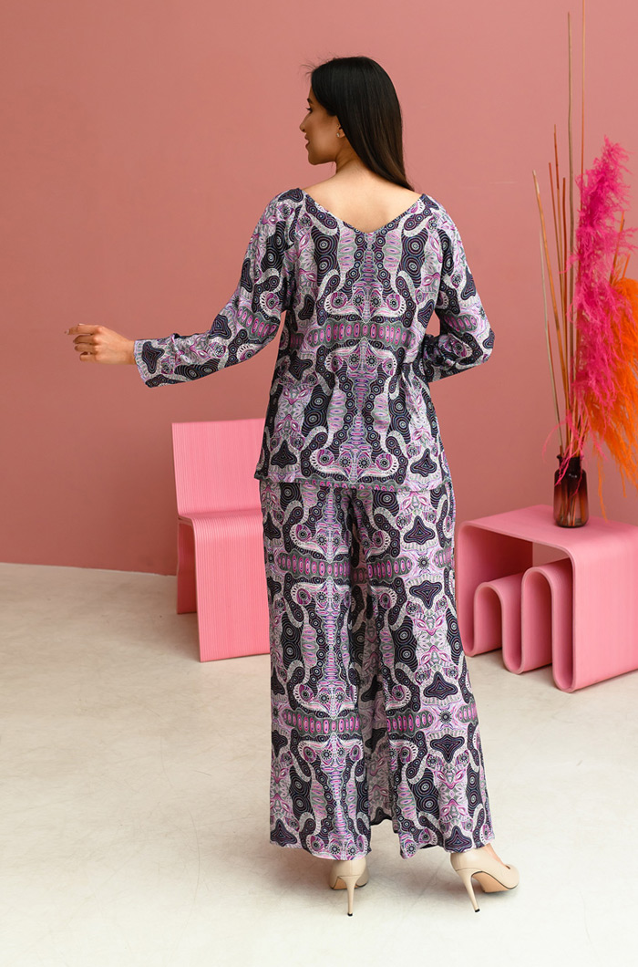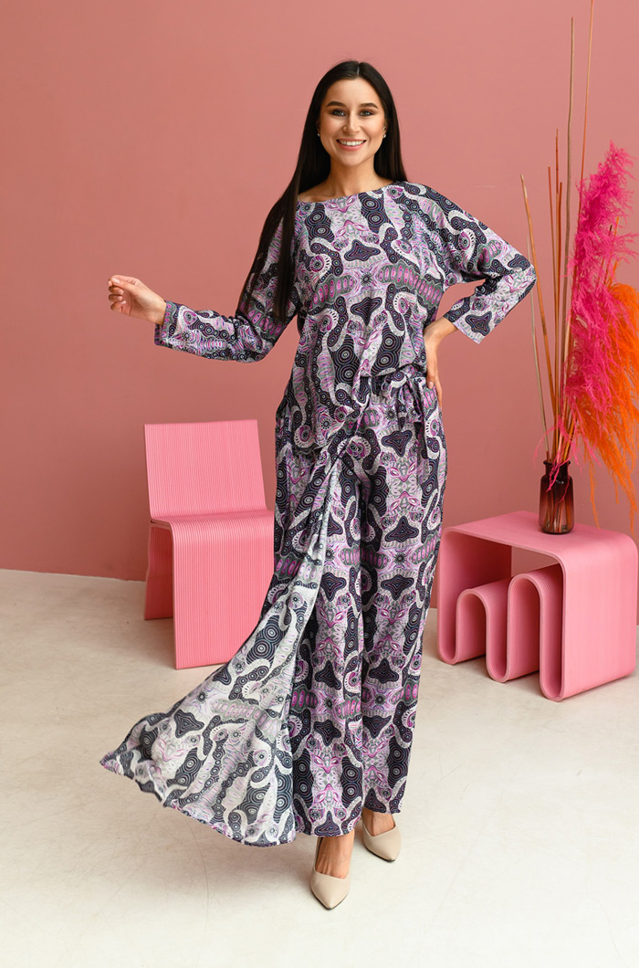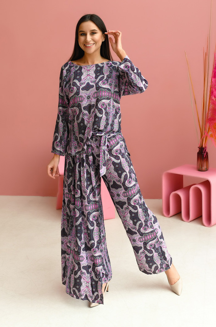 Комплект из туники и брюк с запахом, из принтованной вискозы. Туника средней длины прямого силуэта, рукав реглан. Горловина обработана обтачкой. Вырез горловины лодочка на полочке и V-образный на спинке. Удлиненная деталь спинки. Разрезы в боковых швах. Брюки с запахом, свободного силуэта. Отлетная деталь(юбка) на поясе - завязке. Пояс на эластичной тесьме. 100% вискоза
