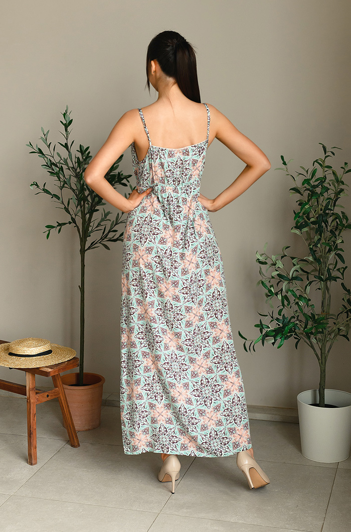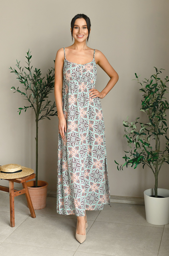 Длинное платье Mia-Mia прямого силуэта выполнено из вискозы с принтом. Платье с отрезной линией под грудью на эластичной тесьме "резинке". На лифе планка на 4-х пуговицах и петлях. Тонкие бретели платья позволяют регулировать высоту лифа данной модели. 100% вискоза