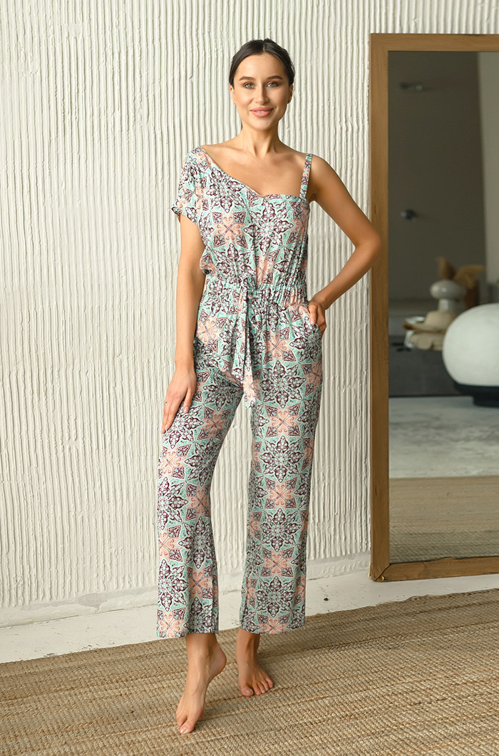 Комбинезон брючный женский Mia-Mia, длинный с карманами, из принтованной вискозы. Ассиметричное решение верха, короткий цельнокроеный, спущенный рукав на правое плечо и бретель на левое плечо из основного полотна с регулировкой. Верхняя и нижняя часть соединённые по линии талии. Пояс-кулиска на эластичной тесьме. Крой брюк свободный, прямой. 100% вискоза