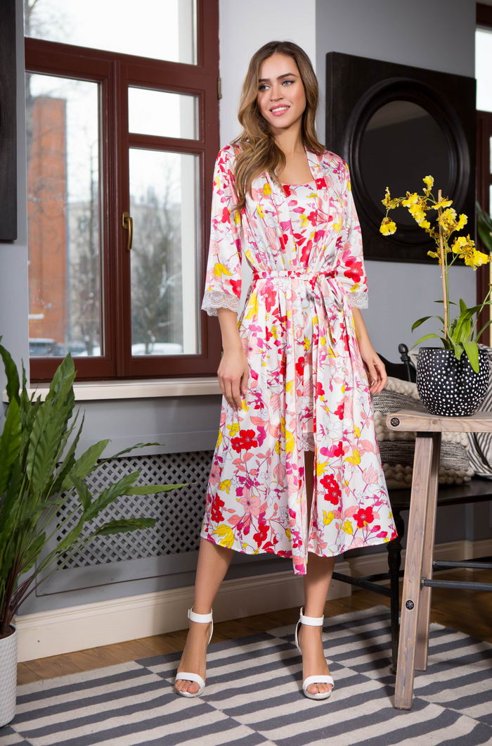 Длинный домашний халат из принтованного шелк-сатина прямого силуэта. Модель с втачным рукавом 3/4 с манжетом из кружева. Халат завязывается на пояс и внутреннюю завязку. В боковых швах карманы. Состав: 100% полиэстер