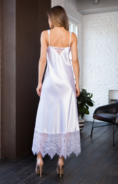 Длинное домашнее женское платье Mia-Mia на регулируемых фигурных бретелях из однотонного сатина. По низу изделия тонкое кружево. Спинка так же декорирована кружевом.
