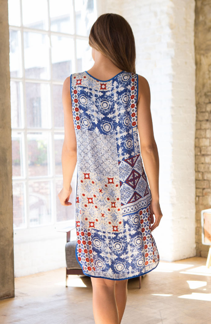 Туника домашняя женская выполнена из принтованного искусственного шёлка. Модель свободного силуэта средней длины. Горловина, рельефы и подол окантованы однотонным шелком.
