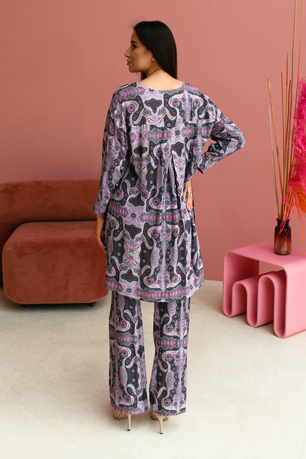 Комплект из удлиненной туники и брюк, выполнен из принтованной вискозы. Туника свободного силуэта. Полочка с застежкой планкой на пуговицах. Спинка оформлена фигурной кокеткой, с вытачками и встречной складкой. Горловина обработана обтачкой. Разрезы в боковых швах. Рукав рубашечный с манжетой на пуговице. Брюки с карманами, свободного силуэта. Пояс на эластичной ленте.