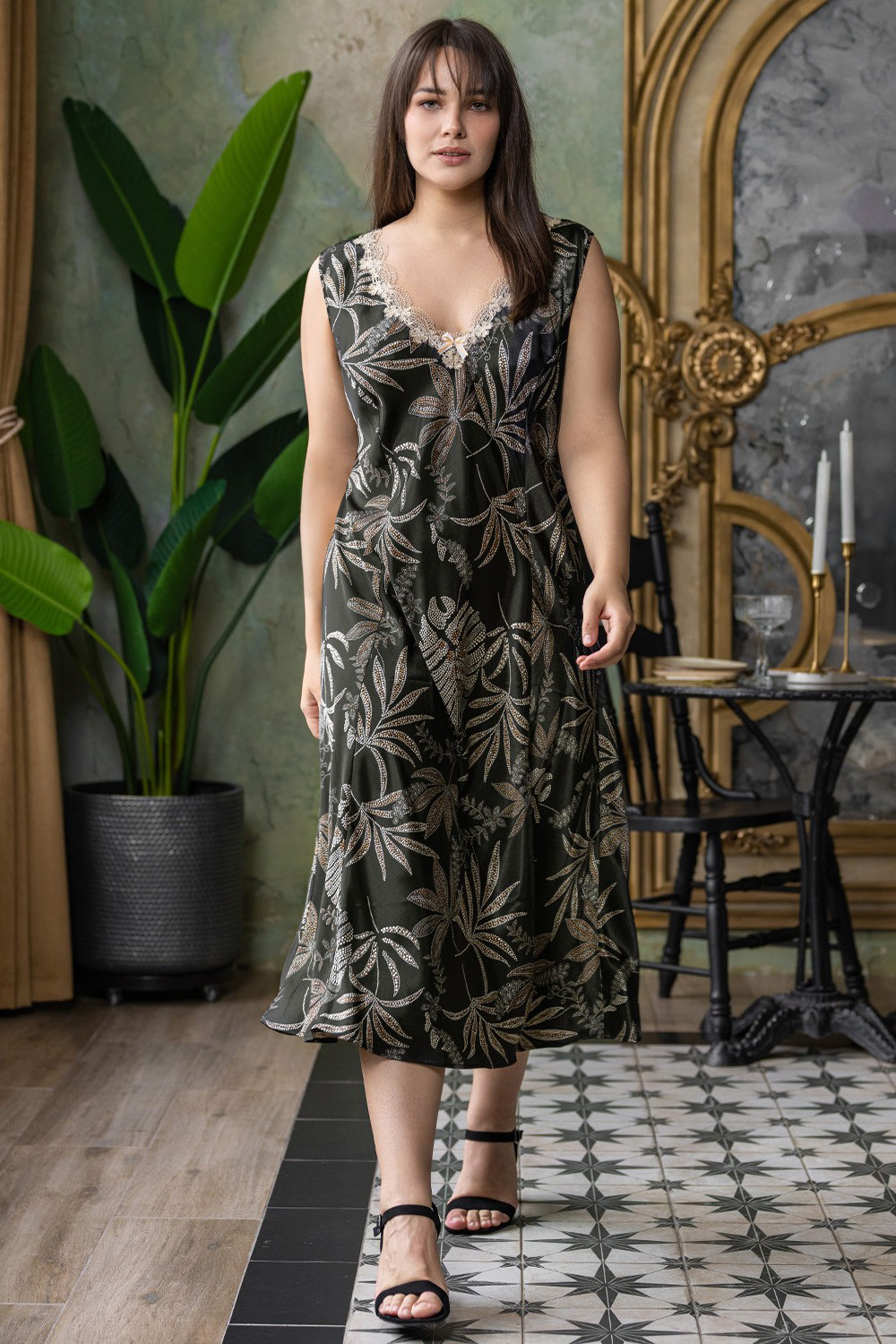 Длинная сорочка Mia-Amore без подреза с широкой бретелью выполнена из принтованного смесового шелка. Вырез горловины декорирован кружевом.
