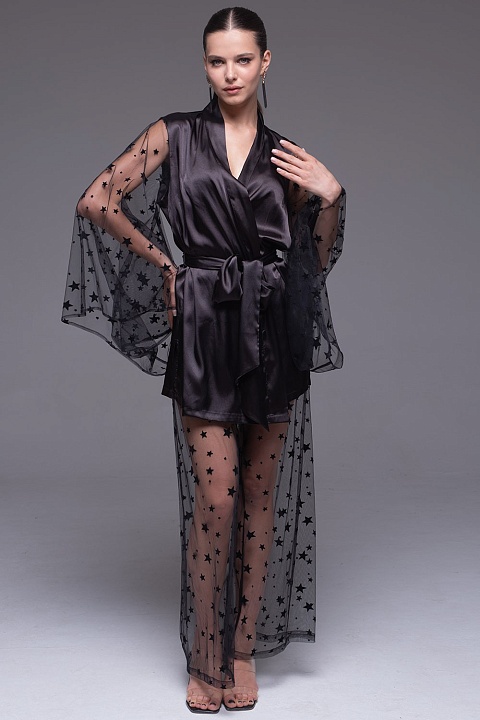Комплект Mia-Amore состоит из четырёх предметов: топа, брюк, шорт и запашного жакета. Укороченный топ спереди из смесового шёлка, эффектная спинка из сетки на завязке. Пышные шорты выполнен полностью из смесового шёлка. Брюки полностью отшиты из сетки, но внутри есть короткая подкладка из атласа. Запашной жакет выполнен из смесового шёлка, эффектные широкие рукава из мягкой сетки со звёздочками.
