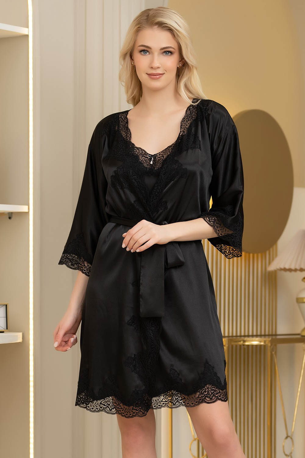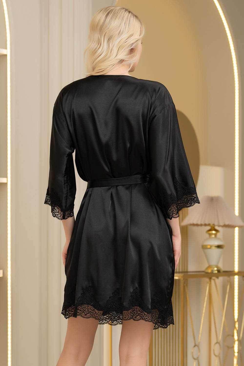 Короткий халат Mia-Amore выполнен из смесового шелкового полотна. Борт, низ халата и рукавов декорированы тонким кружевом, вырезанная по форме кружева кромка ткани придает удивительную воздушность модели.