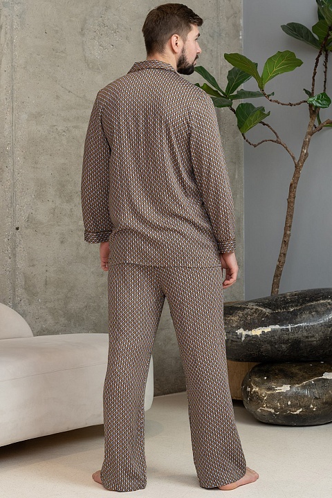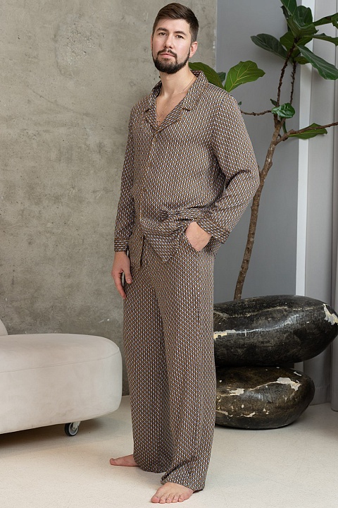 Мужской комплект Mia-Amore состоит из жакета свободного силуэта с длинным рукавом и широких брюк. Изделия комплекта выполнены из тканой принтованной вискозы с шелком. По бокам брюк расположены карманы.