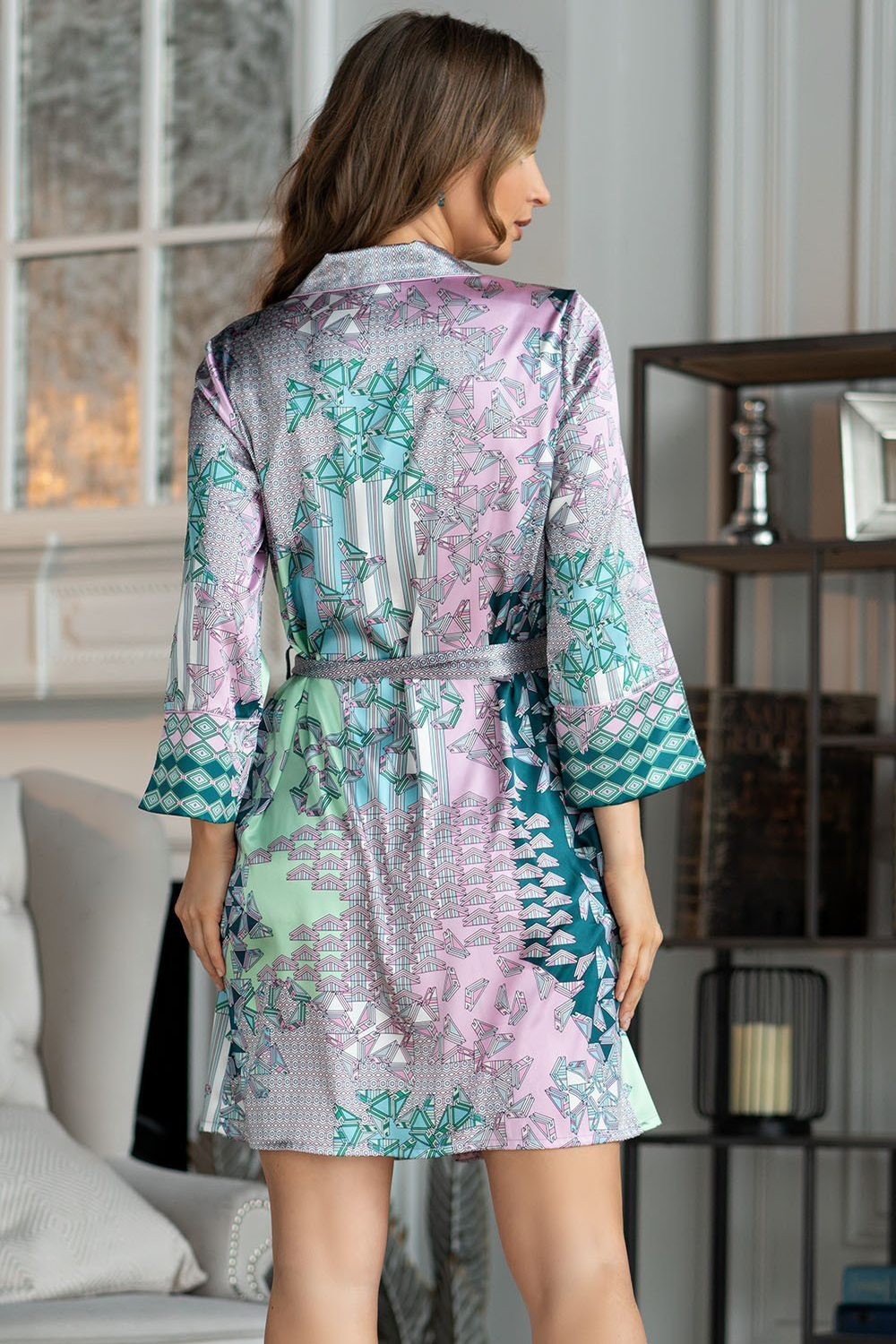 Халат Mia-Amore с застежкой на пуговицы и с рукавами длиной 3/4, выполнен из принтованного искусственного шелка с блеском и отделкой в виде контрастных кантов. В боковых швах обработаны карманы. Линию талии можно подчеркнуть за счет пояса, который идет в комплекте.