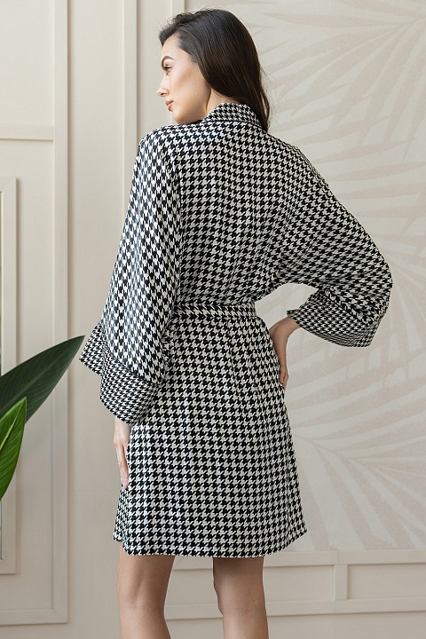 Короткий халат-кимоно Mia-Amore с широким рукавом длиной 3/4 . Халат выполнен из смесового шелка. В изделии используются два вида масштаба одного принта, граница которых разделена контрастным кантом. По бокам обработаны карманы.