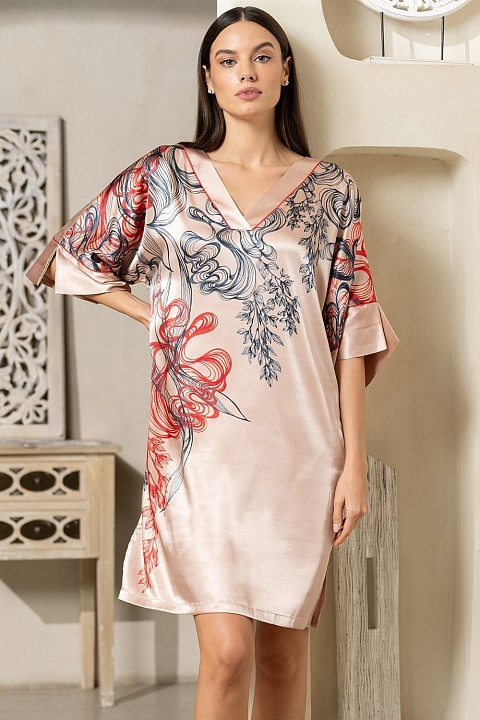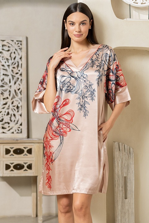 Короткая туника Mia-Amore свободно силуэта с широким рукавом, которая выполнена из искусственного шелка с монопринтом, расположенным на полочке и контрастным кантом в виде отделки. В боковых швах расположены карманы, по низу туники обработаны разрезы. Линию талии можно подчеркнуть за счет пояса, который идет в комплекте.