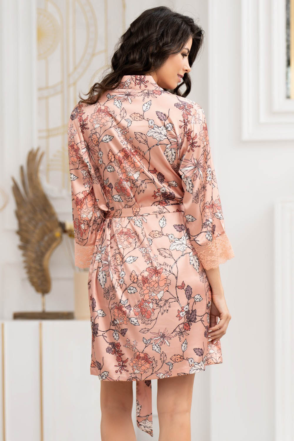 Короткий запашной халат Mia-Amore выполнен из принтованного смесового шелка. Рукава по низу украшены широким кружевом. В боковых швах кармашки.