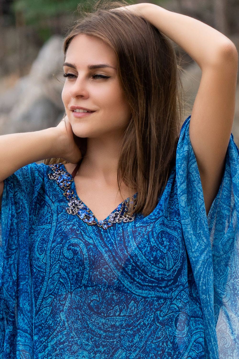 Короткая туника Mia-Amore с рукавом летучая мышь выполнена из принтованного шифона в морской синей гамме, низ туники имеет овальную форму, горловина оформлена бисером и паетками.