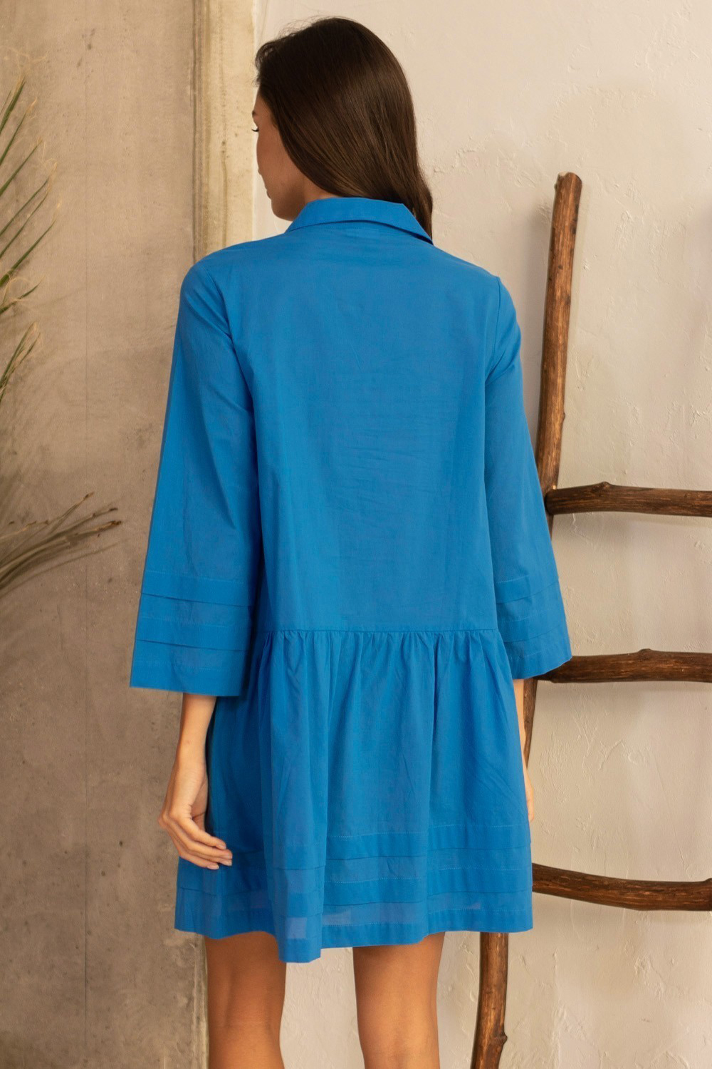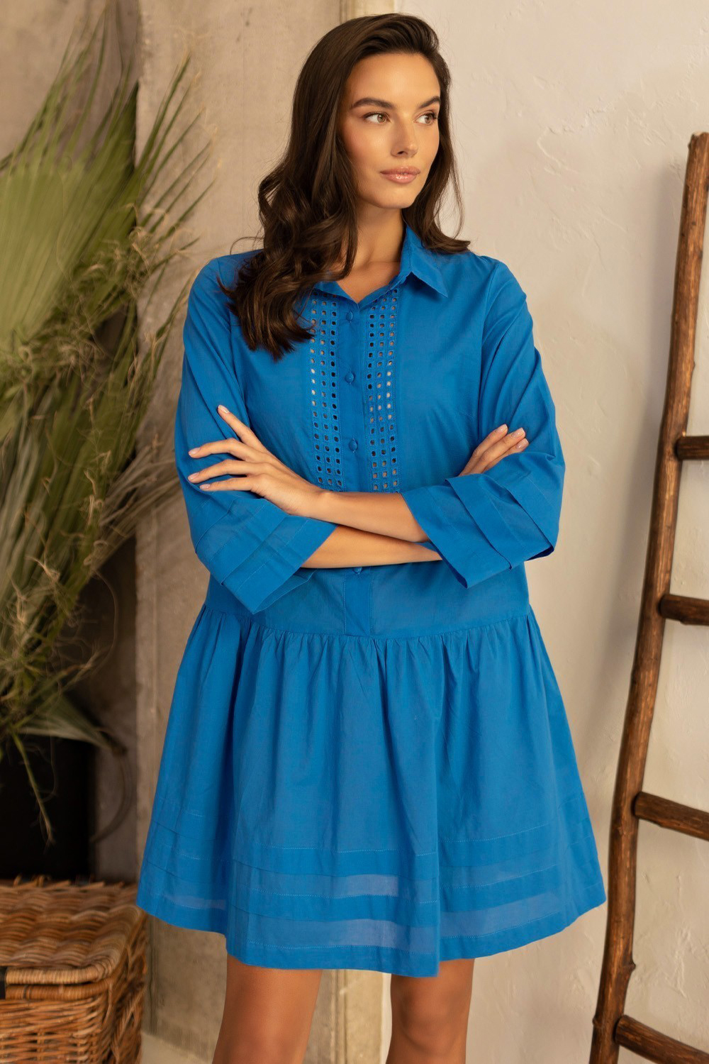 Туника Mia-Amore длиной чуть выше колена, свободного силуэта с центральной застежкой на пуговицы и рукавом длиной 3/4. Изделие выполнено из гладкого хлопка и дополнено декоративными вставками из вышивного хлопка, которые расположены вдоль бортов. По низу рукавов и низу туники заложены горизонтальные складки.