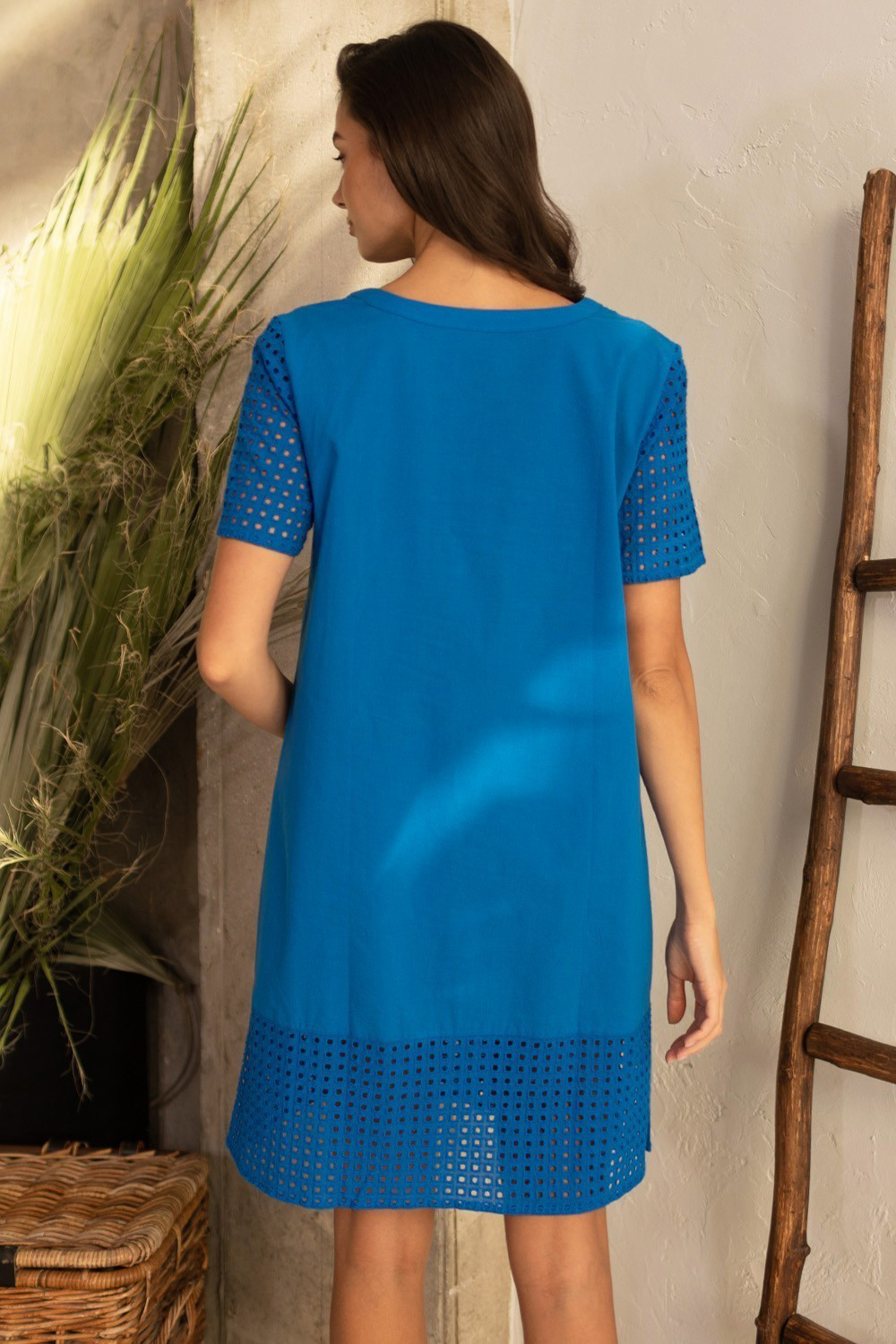 Платье-туника Mia-Amore длиной чуть выше колена, свободного силуэта и коротким рукавом. Изделие выполнено из гладкого хлопка и дополнено декоративными вставками из вышивного хлопка, которые расположены по рукавам и низу туники.