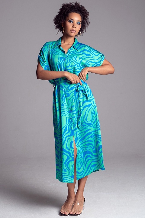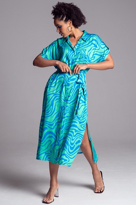 Удлинённая рубашка Mia-Amore выполнена из принтованного вискозного полотна. Удлиненная рубашка на пуговицах с короткими цельнокроенными рукавами, рубашечным воротником и разрезами по бокам, по талии регулируется съемным поясом. Низ рукавов рубашки оформлен узкой манжетой. В боковых швах есть карманы.