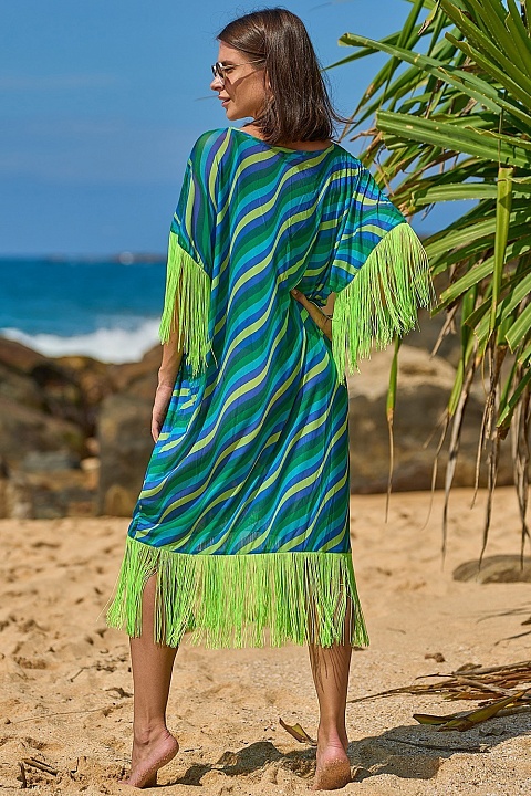 Туника Mia-Amore длиной до колен с удлинёнными рукавами выполнена из сетки, по низу туника и рукава декорированы яркой шёлковой бахромой.