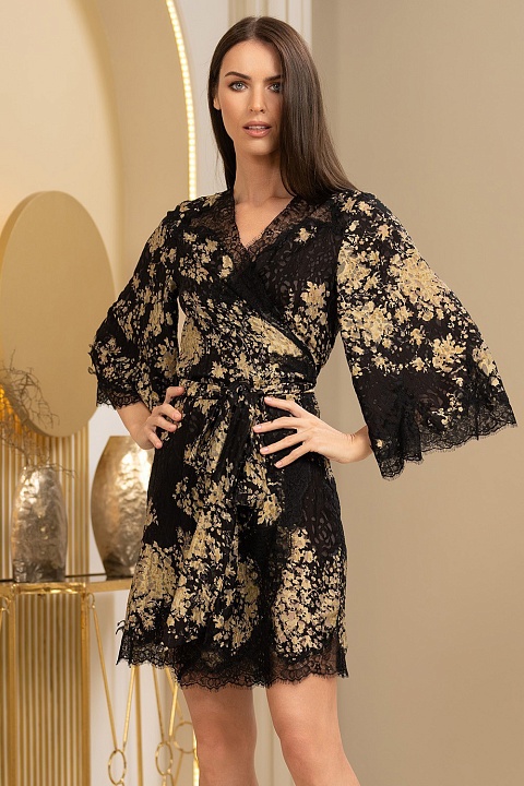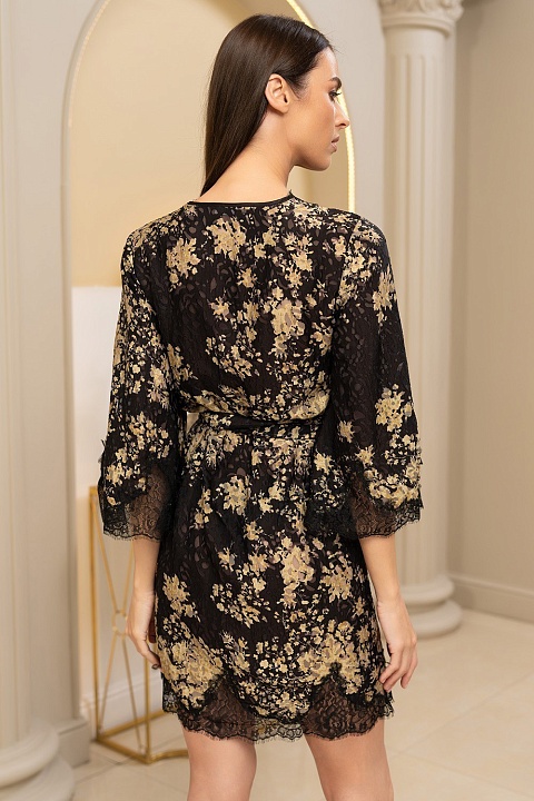 Принтованный короткий запашной халат Mia-Amore выполнен из вискозно-шёлкового полотна деворе. Борт, низ халата и низ широких рукавов украшены ажурным чёрным кружевом. Халат запахивается широким притачным поясом, который запахивается вкруговую по талии.